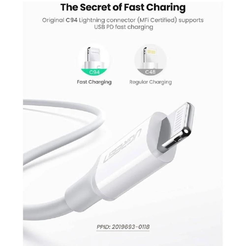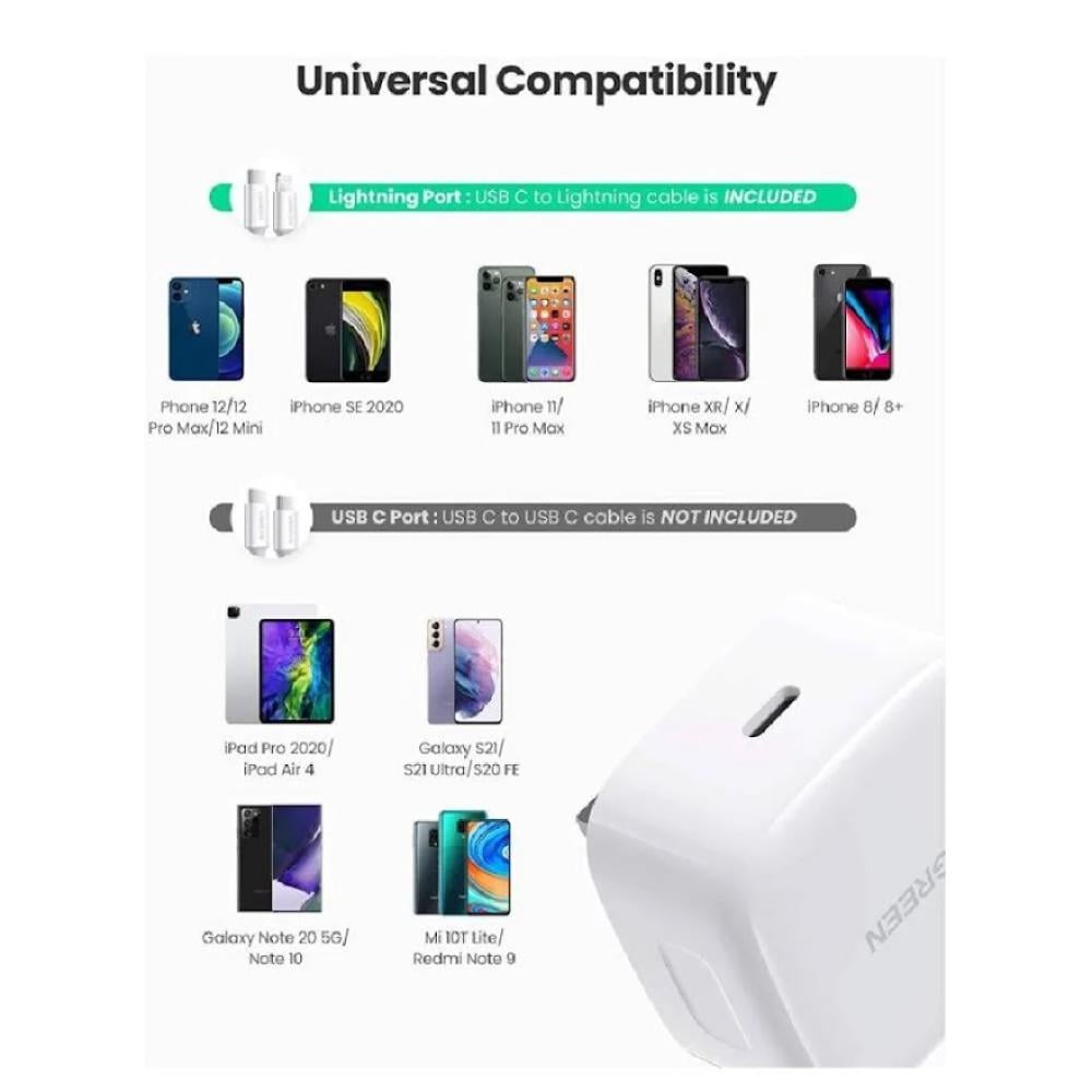 يوجرين - شاحن جداري بمنفذ تايب سي مع كيبل بي دي ايفون بقوة 20 واط - ابيض